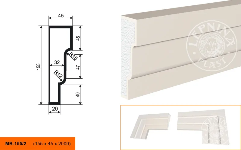 Молдинг МВ-155/2 производителя LEPNINAPLAST изготовленный из полистирола высокой плотности, который покрыт эластичной шпатлевкой PS Technoplaster, покрытие абсолютно устойчиво к атмосферным и механическим повреждениям. Молдинг используют для обрамления окон, межэтажного разделения, может использоваться как в новом строительстве, так и при реставрации старых зданий для придания им нового внешнего вида. Профиль обладает рядом преимуществ, таких как легкий вес, прочность, устойчивость к влаге. Установка молдинга производится в соответствии с инструкциями производителя, что обеспечивает правильное и надежное крепление. Перед покраской не требуется обязательная покрытие грунтовкой, для склеивания изделий между собой рекомендуется использовать клея: CERESIT CT 84, PENOSIL FIXGo, TYTAN STYRO 753.