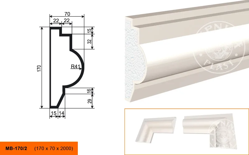 Молдинг МВ-170/2 производителя LEPNINAPLAST изготовленный из полистирола высокой плотности, который покрыт эластичной шпатлевкой PS Technoplaster, покрытие абсолютно устойчиво к атмосферным и механическим повреждениям. Молдинг используют для обрамления окон, межэтажного разделения, может использоваться как в новом строительстве, так и при реставрации старых зданий для придания им нового внешнего вида. Профиль обладает рядом преимуществ, таких как легкий вес, прочность, устойчивость к влаге. Установка молдинга производится в соответствии с инструкциями производителя, что обеспечивает правильное и надежное крепление. Перед покраской не требуется обязательная покрытие грунтовкой, для склеивания изделий между собой рекомендуется использовать клея: CERESIT CT 84, PENOSIL FIXGo, TYTAN STYRO 753.