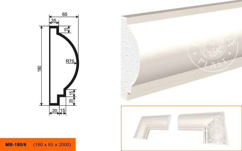 Молдинг МВ-180/6 производителя LEPNINAPLAST изготовленный из полистирола высокой плотности, который покрыт эластичной шпатлевкой PS Technoplaster, покрытие абсолютно устойчиво к атмосферным и механическим повреждениям. Молдинг используют для обрамления окон, межэтажного разделения, может использоваться как в новом строительстве, так и при реставрации старых зданий для придания им нового внешнего вида. Профиль обладает рядом преимуществ, таких как легкий вес, прочность, устойчивость к влаге. Установка молдинга производится в соответствии с инструкциями производителя, что обеспечивает правильное и надежное крепление. Перед покраской не требуется обязательная покрытие грунтовкой, для склеивания изделий между собой рекомендуется использовать клея: CERESIT CT 84, PENOSIL FIXGo, TYTAN STYRO 753.
