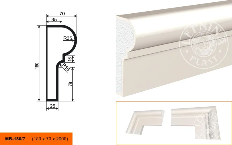 Молдинг МВ-180/7 производителя LEPNINAPLAST изготовленный из полистирола высокой плотности, который покрыт эластичной шпатлевкой PS Technoplaster, покрытие абсолютно устойчиво к атмосферным и механическим повреждениям. Молдинг используют для обрамления окон, межэтажного разделения, может использоваться как в новом строительстве, так и при реставрации старых зданий для придания им нового внешнего вида. Профиль обладает рядом преимуществ, таких как легкий вес, прочность, устойчивость к влаге. Установка молдинга производится в соответствии с инструкциями производителя, что обеспечивает правильное и надежное крепление. Перед покраской не требуется обязательная покрытие грунтовкой, для склеивания изделий между собой рекомендуется использовать клея: CERESIT CT 84, PENOSIL FIXGo, TYTAN STYRO 753.