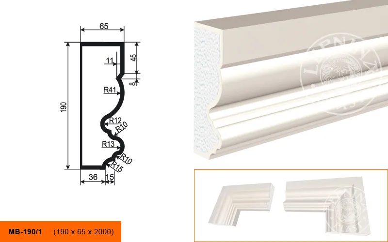 Молдинг МВ-190/1 производителя LEPNINAPLAST изготовленный из полистирола высокой плотности, который покрыт эластичной шпатлевкой PS Technoplaster, покрытие абсолютно устойчиво к атмосферным и механическим повреждениям. Молдинг используют для обрамления окон, межэтажного разделения, может использоваться как в новом строительстве, так и при реставрации старых зданий для придания им нового внешнего вида. Профиль обладает рядом преимуществ, таких как легкий вес, прочность, устойчивость к влаге. Установка молдинга производится в соответствии с инструкциями производителя, что обеспечивает правильное и надежное крепление. Перед покраской не требуется обязательная покрытие грунтовкой, для склеивания изделий между собой рекомендуется использовать клея: CERESIT CT 84, PENOSIL FIXGo, TYTAN STYRO 753.