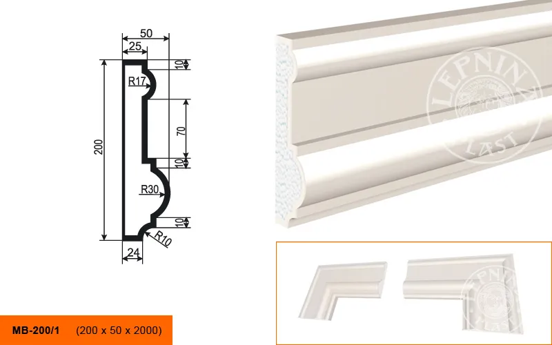 Молдинг МВ-200/1 производителя LEPNINAPLAST изготовленный из полистирола высокой плотности, который покрыт эластичной шпатлевкой PS Technoplaster, покрытие абсолютно устойчиво к атмосферным и механическим повреждениям. Молдинг используют для обрамления окон, межэтажного разделения, может использоваться как в новом строительстве, так и при реставрации старых зданий для придания им нового внешнего вида. Профиль обладает рядом преимуществ, таких как легкий вес, прочность, устойчивость к влаге. Установка молдинга производится в соответствии с инструкциями производителя, что обеспечивает правильное и надежное крепление. Перед покраской не требуется обязательная покрытие грунтовкой, для склеивания изделий между собой рекомендуется использовать клея: CERESIT CT 84, PENOSIL FIXGo, TYTAN STYRO 753.