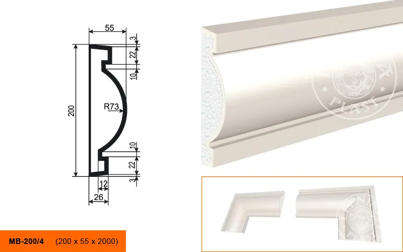 Молдинг МВ-200/4 производителя LEPNINAPLAST изготовленный из полистирола высокой плотности, который покрыт эластичной шпатлевкой PS Technoplaster, покрытие абсолютно устойчиво к атмосферным и механическим повреждениям. Молдинг используют для обрамления окон, межэтажного разделения, может использоваться как в новом строительстве, так и при реставрации старых зданий для придания им нового внешнего вида. Профиль обладает рядом преимуществ, таких как легкий вес, прочность, устойчивость к влаге. Установка молдинга производится в соответствии с инструкциями производителя, что обеспечивает правильное и надежное крепление. Перед покраской не требуется обязательная покрытие грунтовкой, для склеивания изделий между собой рекомендуется использовать клея: CERESIT CT 84, PENOSIL FIXGo, TYTAN STYRO 753.