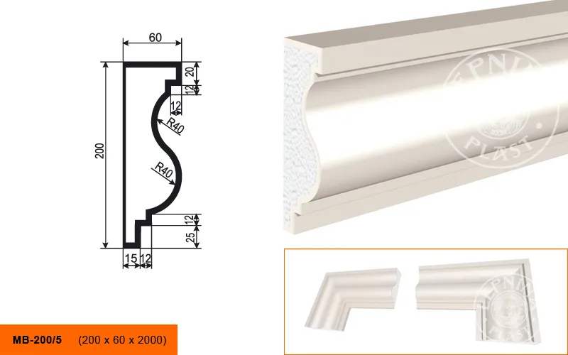 Молдинг МВ-200/5 производителя LEPNINAPLAST изготовленный из полистирола высокой плотности, который покрыт эластичной шпатлевкой PS Technoplaster, покрытие абсолютно устойчиво к атмосферным и механическим повреждениям. Молдинг используют для обрамления окон, межэтажного разделения, может использоваться как в новом строительстве, так и при реставрации старых зданий для придания им нового внешнего вида. Профиль обладает рядом преимуществ, таких как легкий вес, прочность, устойчивость к влаге. Установка молдинга производится в соответствии с инструкциями производителя, что обеспечивает правильное и надежное крепление. Перед покраской не требуется обязательная покрытие грунтовкой, для склеивания изделий между собой рекомендуется использовать клея: CERESIT CT 84, PENOSIL FIXGo, TYTAN STYRO 753.