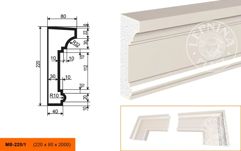 Молдинг МВ-220/1 производителя LEPNINAPLAST изготовленный из полистирола высокой плотности, который покрыт эластичной шпатлевкой PS Technoplaster, покрытие абсолютно устойчиво к атмосферным и механическим повреждениям. Молдинг используют для обрамления окон, межэтажного разделения, может использоваться как в новом строительстве, так и при реставрации старых зданий для придания им нового внешнего вида. Профиль обладает рядом преимуществ, таких как легкий вес, прочность, устойчивость к влаге. Установка молдинга производится в соответствии с инструкциями производителя, что обеспечивает правильное и надежное крепление. Перед покраской не требуется обязательная покрытие грунтовкой, для склеивания изделий между собой рекомендуется использовать клея: CERESIT CT 84, PENOSIL FIXGo, TYTAN STYRO 753.