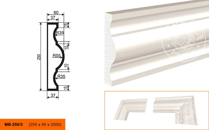 Молдинг МВ-250/3 производителя LEPNINAPLAST изготовленный из полистирола высокой плотности, который покрыт эластичной шпатлевкой PS Technoplaster, покрытие абсолютно устойчиво к атмосферным и механическим повреждениям. Молдинг используют для обрамления окон, межэтажного разделения, может использоваться как в новом строительстве, так и при реставрации старых зданий для придания им нового внешнего вида. Профиль обладает рядом преимуществ, таких как легкий вес, прочность, устойчивость к влаге. Установка молдинга производится в соответствии с инструкциями производителя, что обеспечивает правильное и надежное крепление. Перед покраской не требуется обязательная покрытие грунтовкой, для склеивания изделий между собой рекомендуется использовать клея: CERESIT CT 84, PENOSIL FIXGo, TYTAN STYRO 753.