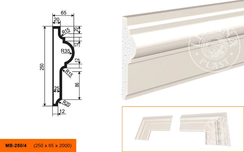 Молдинг МВ-250/4 производителя LEPNINAPLAST изготовленный из полистирола высокой плотности, который покрыт эластичной шпатлевкой PS Technoplaster, покрытие абсолютно устойчиво к атмосферным и механическим повреждениям. Молдинг используют для обрамления окон, межэтажного разделения, может использоваться как в новом строительстве, так и при реставрации старых зданий для придания им нового внешнего вида. Профиль обладает рядом преимуществ, таких как легкий вес, прочность, устойчивость к влаге. Установка молдинга производится в соответствии с инструкциями производителя, что обеспечивает правильное и надежное крепление. Перед покраской не требуется обязательная покрытие грунтовкой, для склеивания изделий между собой рекомендуется использовать клея: CERESIT CT 84, PENOSIL FIXGo, TYTAN STYRO 753.