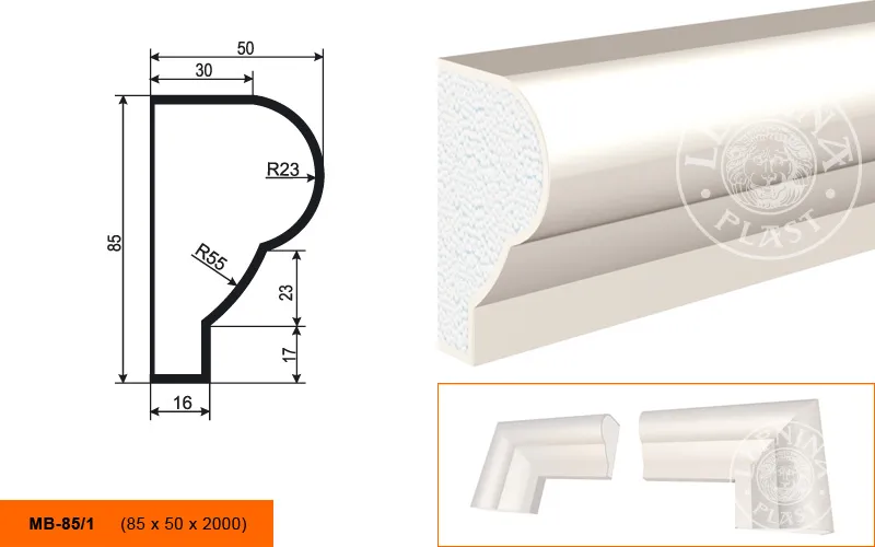 Молдинг МВ-85/1 производителя LEPNINAPLAST изготовленный из полистирола высокой плотности, который покрыт эластичной шпатлевкой PS Technoplaster, покрытие абсолютно устойчиво к атмосферным и механическим повреждениям. Молдинг используют для обрамления окон, межэтажного разделения, может использоваться как в новом строительстве, так и при реставрации старых зданий для придания им нового внешнего вида. Профиль обладает рядом преимуществ, таких как легкий вес, прочность, устойчивость к влаге. Установка молдинга производится в соответствии с инструкциями производителя, что обеспечивает правильное и надежное крепление. Перед покраской не требуется обязательная покрытие грунтовкой, для склеивания изделий между собой рекомендуется использовать клея: CERESIT CT 84, PENOSIL FIXGo, TYTAN STYRO 753.