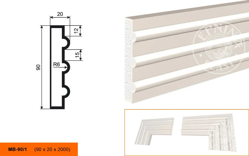 Молдинг МВ-90/1 производителя LEPNINAPLAST изготовленный из полистирола высокой плотности, который покрыт эластичной шпатлевкой PS Technoplaster, покрытие абсолютно устойчиво к атмосферным и механическим повреждениям. Молдинг используют для обрамления окон, межэтажного разделения, может использоваться как в новом строительстве, так и при реставрации старых зданий для придания им нового внешнего вида. Профиль обладает рядом преимуществ, таких как легкий вес, прочность, устойчивость к влаге. Установка молдинга производится в соответствии с инструкциями производителя, что обеспечивает правильное и надежное крепление. Перед покраской не требуется обязательная покрытие грунтовкой, для склеивания изделий между собой рекомендуется использовать клея: CERESIT CT 84, PENOSIL FIXGo, TYTAN STYRO 753.