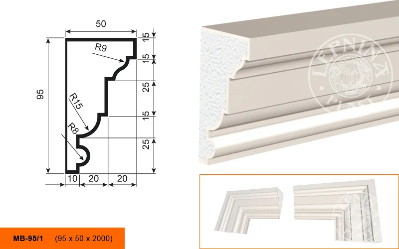 Молдинг МВ-95/1 производителя LEPNINAPLAST изготовленный из полистирола высокой плотности, который покрыт эластичной шпатлевкой PS Technoplaster, покрытие абсолютно устойчиво к атмосферным и механическим повреждениям. Молдинг используют для обрамления окон, межэтажного разделения, может использоваться как в новом строительстве, так и при реставрации старых зданий для придания им нового внешнего вида. Профиль обладает рядом преимуществ, таких как легкий вес, прочность, устойчивость к влаге. Установка молдинга производится в соответствии с инструкциями производителя, что обеспечивает правильное и надежное крепление. Перед покраской не требуется обязательная покрытие грунтовкой, для склеивания изделий между собой рекомендуется использовать клея: CERESIT CT 84, PENOSIL FIXGo, TYTAN STYRO 753.