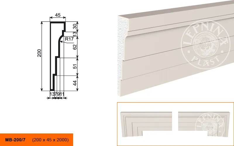 Молдинг МВ-200/7 производителя LEPNINAPLAST изготовленный из полистирола высокой плотности, который покрыт эластичной шпатлевкой PS Technoplaster, покрытие абсолютно устойчиво к атмосферным и механическим повреждениям. Молдинг используют для обрамления окон, межэтажного разделения, может использоваться как в новом строительстве, так и при реставрации старых зданий для придания им нового внешнего вида. Профиль обладает рядом преимуществ, таких как легкий вес, прочность, устойчивость к влаге. Установка молдинга производится в соответствии с инструкциями производителя, что обеспечивает правильное и надежное крепление. Перед покраской не требуется обязательная покрытие грунтовкой, для склеивания изделий между собой рекомендуется использовать клея: CERESIT CT 84, PENOSIL FIXGo, TYTAN STYRO 753.