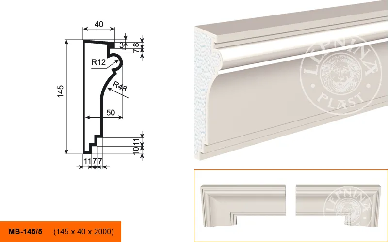 Молдинг МВ-145/5 производителя LEPNINAPLAST изготовленный из полистирола высокой плотности, который покрыт эластичной шпатлевкой PS Technoplaster, покрытие абсолютно устойчиво к атмосферным и механическим повреждениям. Молдинг используют для обрамления окон, межэтажного разделения, может использоваться как в новом строительстве, так и при реставрации старых зданий для придания им нового внешнего вида. Профиль обладает рядом преимуществ, таких как легкий вес, прочность, устойчивость к влаге. Установка молдинга производится в соответствии с инструкциями производителя, что обеспечивает правильное и надежное крепление. Перед покраской не требуется обязательная покрытие грунтовкой, для склеивания изделий между собой рекомендуется использовать клея: CERESIT CT 84, PENOSIL FIXGo, TYTAN STYRO 753.