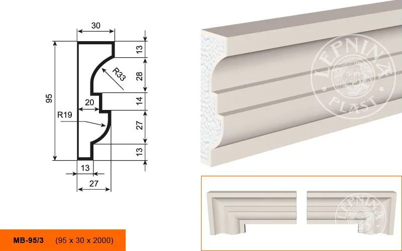 Молдинг МВ-95/3 производителя LEPNINAPLAST изготовленный из полистирола высокой плотности, который покрыт эластичной шпатлевкой PS Technoplaster, покрытие абсолютно устойчиво к атмосферным и механическим повреждениям. Молдинг используют для обрамления окон, межэтажного разделения, может использоваться как в новом строительстве, так и при реставрации старых зданий для придания им нового внешнего вида. Профиль обладает рядом преимуществ, таких как легкий вес, прочность, устойчивость к влаге. Установка молдинга производится в соответствии с инструкциями производителя, что обеспечивает правильное и надежное крепление. Перед покраской не требуется обязательная покрытие грунтовкой, для склеивания изделий между собой рекомендуется использовать клея: CERESIT CT 84, PENOSIL FIXGo, TYTAN STYRO 753.