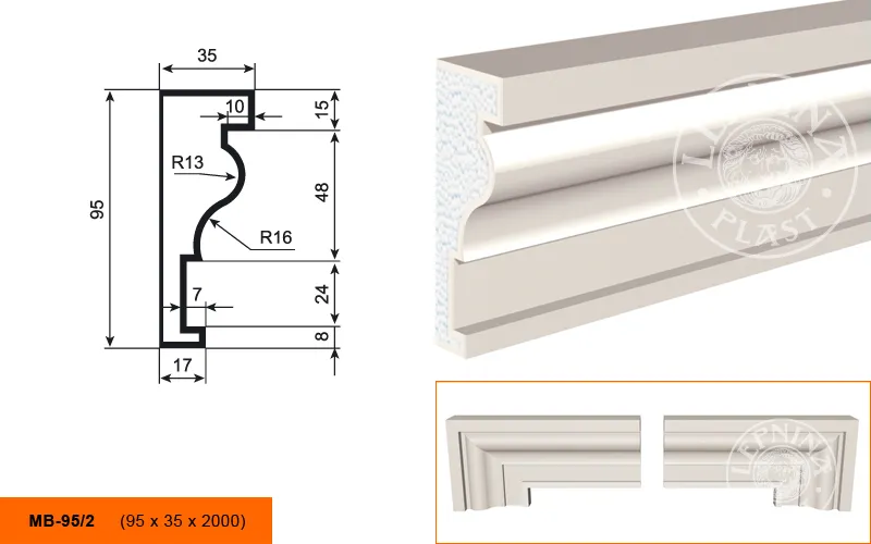 Молдинг МВ-95/2 производителя LEPNINAPLAST изготовленный из полистирола высокой плотности, который покрыт эластичной шпатлевкой PS Technoplaster, покрытие абсолютно устойчиво к атмосферным и механическим повреждениям. Молдинг используют для обрамления окон, межэтажного разделения, может использоваться как в новом строительстве, так и при реставрации старых зданий для придания им нового внешнего вида. Профиль обладает рядом преимуществ, таких как легкий вес, прочность, устойчивость к влаге. Установка молдинга производится в соответствии с инструкциями производителя, что обеспечивает правильное и надежное крепление. Перед покраской не требуется обязательная покрытие грунтовкой, для склеивания изделий между собой рекомендуется использовать клея: CERESIT CT 84, PENOSIL FIXGo, TYTAN STYRO 753.