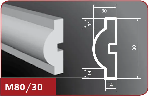 Фасадный молдинг М80/30 изготовлен из пенопласта (пенополистирол), верхний слой которого представляет собой эластичное покрытие на основе акриловых полимеров, а армирующее покрытие выполнено из кварцевого песка. Это изделие предназначено для покраски и идеально подходит для отделки наружных поверхностей. Особенности изделий из пенопласта включают в себя высокую прочность, влагостойкость, легкий вес и возможность монтажа на обычную штукатурку, на утепленные (в том числе вентилируемые) фасады. Пенопластовые молдинги легко обрабатывать и хорошо переносят различные температурные воздействия, что делает их долговечными и очень надежными.