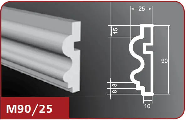 Фасадный молдинг М90/25 изготовлен из пенопласта (пенополистирол), верхний слой которого представляет собой эластичное покрытие на основе акриловых полимеров, а армирующее покрытие выполнено из кварцевого песка. Это изделие предназначено для покраски и идеально подходит для отделки наружных поверхностей. Особенности изделий из пенопласта включают в себя высокую прочность, влагостойкость, легкий вес и возможность монтажа на обычную штукатурку, на утепленные (в том числе вентилируемые) фасады. Пенопластовые молдинги легко обрабатывать и хорошо переносят различные температурные воздействия, что делает их долговечными и очень надежными.