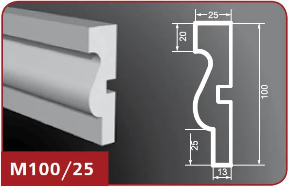 Фасадный молдинг М100/25 изготовлен из пенопласта (пенополистирол), верхний слой которого представляет собой эластичное покрытие на основе акриловых полимеров, а армирующее покрытие выполнено из кварцевого песка. Это изделие предназначено для покраски и идеально подходит для отделки наружных поверхностей. Особенности изделий из пенопласта включают в себя высокую прочность, влагостойкость, легкий вес и возможность монтажа на обычную штукатурку, на утепленные (в том числе вентилируемые) фасады. Пенопластовые молдинги легко обрабатывать и хорошо переносят различные температурные воздействия, что делает их долговечными и очень надежными.