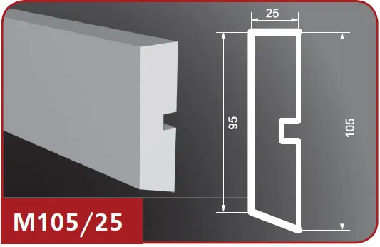 Фасадный молдинг М105/25 изготовлен из пенопласта (пенополистирол), верхний слой которого представляет собой эластичное покрытие на основе акриловых полимеров, а армирующее покрытие выполнено из кварцевого песка. Это изделие предназначено для покраски и идеально подходит для отделки наружных поверхностей. Особенности изделий из пенопласта включают в себя высокую прочность, влагостойкость, легкий вес и возможность монтажа на обычную штукатурку, на утепленные (в том числе вентилируемые) фасады. Пенопластовые молдинги легко обрабатывать и хорошо переносят различные температурные воздействия, что делает их долговечными и очень надежными.