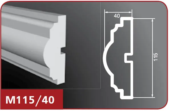 Фасадный молдинг М115/40 изготовлен из пенопласта (пенополистирол), верхний слой которого представляет собой эластичное покрытие на основе акриловых полимеров, а армирующее покрытие выполнено из кварцевого песка. Это изделие предназначено для покраски и идеально подходит для отделки наружных поверхностей. Особенности изделий из пенопласта включают в себя высокую прочность, влагостойкость, легкий вес и возможность монтажа на обычную штукатурку, на утепленные (в том числе вентилируемые) фасады. Пенопластовые молдинги легко обрабатывать и хорошо переносят различные температурные воздействия, что делает их долговечными и очень надежными.