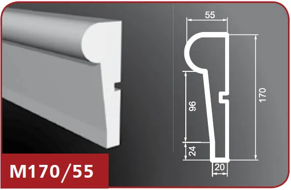 Фасадный молдинг М170/55 изготовлен из пенопласта (пенополистирол), верхний слой которого представляет собой эластичное покрытие на основе акриловых полимеров, а армирующее покрытие выполнено из кварцевого песка. Это изделие предназначено для покраски и идеально подходит для отделки наружных поверхностей. Особенности изделий из пенопласта включают в себя высокую прочность, влагостойкость, легкий вес и возможность монтажа на обычную штукатурку, на утепленные (в том числе вентилируемые) фасады. Пенопластовые молдинги легко обрабатывать и хорошо переносят различные температурные воздействия, что делает их долговечными и очень надежными.