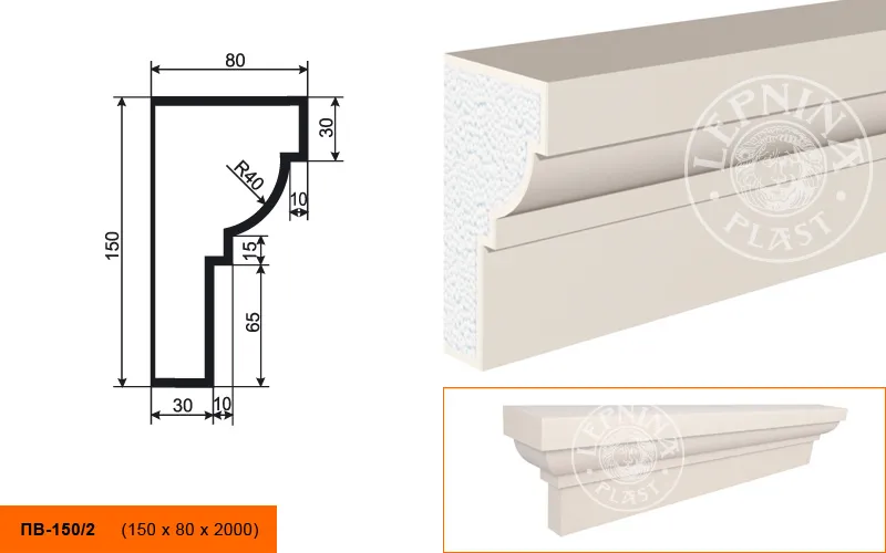 Подоконник ПВ-150/2 производителя LEPNINAPLAST изготовленный из полистирола высокой плотности, который покрыт эластичной шпатлевкой PS Technoplaster, покрытие абсолютно устойчиво к атмосферным и механическим повреждениям. Оконные проемы часто становятся точкой проникновения шума с улицы. Правильный выбор внешних подоконников позволяет не только украсить здание, но и обеспечить в нем тишину. Подоконный элемент обладает рядом преимуществ, таких как легкий вес, прочность, устойчивость к влаге. Установка подоконника производится в соответствии с инструкциями производителя, что обеспечивает правильное и надежное крепление. Перед покраской не требуется обязательная покрытие грунтовкой, для склеивания изделий между собой рекомендуется использовать клея: CERESIT CT 84, PENOSIL FIXGo, TYTAN STYRO 753.