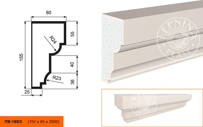 Подоконник ПВ-155/3 производителя LEPNINAPLAST изготовленный из полистирола высокой плотности, который покрыт эластичной шпатлевкой PS Technoplaster, покрытие абсолютно устойчиво к атмосферным и механическим повреждениям. Оконные проемы часто становятся точкой проникновения шума с улицы. Правильный выбор внешних подоконников позволяет не только украсить здание, но и обеспечить в нем тишину. Подоконный элемент обладает рядом преимуществ, таких как легкий вес, прочность, устойчивость к влаге. Установка подоконника производится в соответствии с инструкциями производителя, что обеспечивает правильное и надежное крепление. Перед покраской не требуется обязательная покрытие грунтовкой, для склеивания изделий между собой рекомендуется использовать клея: CERESIT CT 84, PENOSIL FIXGo, TYTAN STYRO 753.