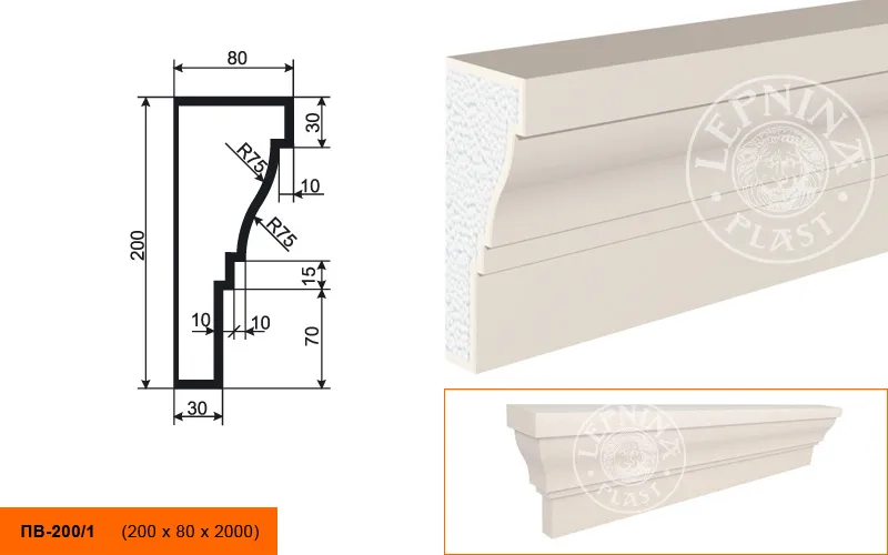Подоконник ПВ-200/1 производителя LEPNINAPLAST изготовленный из полистирола высокой плотности, который покрыт эластичной шпатлевкой PS Technoplaster, покрытие абсолютно устойчиво к атмосферным и механическим повреждениям. Оконные проемы часто становятся точкой проникновения шума с улицы. Правильный выбор внешних подоконников позволяет не только украсить здание, но и обеспечить в нем тишину. Подоконный элемент обладает рядом преимуществ, таких как легкий вес, прочность, устойчивость к влаге. Установка подоконника производится в соответствии с инструкциями производителя, что обеспечивает правильное и надежное крепление. Перед покраской не требуется обязательная покрытие грунтовкой, для склеивания изделий между собой рекомендуется использовать клея: CERESIT CT 84, PENOSIL FIXGo, TYTAN STYRO 753.