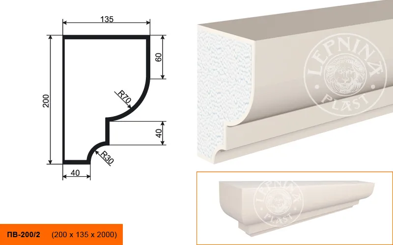 Подоконник ПВ-200/2 производителя LEPNINAPLAST изготовленный из полистирола высокой плотности, который покрыт эластичной шпатлевкой PS Technoplaster, покрытие абсолютно устойчиво к атмосферным и механическим повреждениям. Оконные проемы часто становятся точкой проникновения шума с улицы. Правильный выбор внешних подоконников позволяет не только украсить здание, но и обеспечить в нем тишину. Подоконный элемент обладает рядом преимуществ, таких как легкий вес, прочность, устойчивость к влаге. Установка подоконника производится в соответствии с инструкциями производителя, что обеспечивает правильное и надежное крепление. Перед покраской не требуется обязательная покрытие грунтовкой, для склеивания изделий между собой рекомендуется использовать клея: CERESIT CT 84, PENOSIL FIXGo, TYTAN STYRO 753.