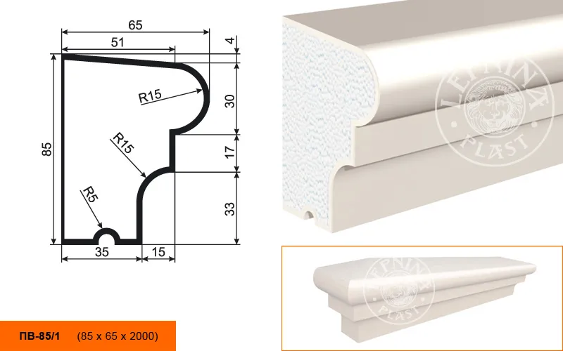 Подоконник ПВ-85/1 производителя LEPNINAPLAST изготовленный из полистирола высокой плотности, который покрыт эластичной шпатлевкой PS Technoplaster, покрытие абсолютно устойчиво к атмосферным и механическим повреждениям. Оконные проемы часто становятся точкой проникновения шума с улицы. Правильный выбор внешних подоконников позволяет не только украсить здание, но и обеспечить в нем тишину. Подоконный элемент обладает рядом преимуществ, таких как легкий вес, прочность, устойчивость к влаге. Установка подоконника производится в соответствии с инструкциями производителя, что обеспечивает правильное и надежное крепление. Перед покраской не требуется обязательная покрытие грунтовкой, для склеивания изделий между собой рекомендуется использовать клея: CERESIT CT 84, PENOSIL FIXGo, TYTAN STYRO 753.