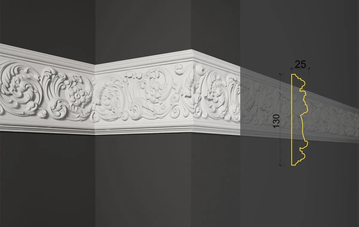 . Гипсовые элементы обладают рядом преимуществ, таких как экологическая безопасность, способность впитывать влагу, огнестойкость, долговечность до 100 лет, отличные декоративные характеристики, легкость в ремонте, идеальная форма каждого компонента и безупречная проработка деталей узоров. Фигурные планки поставляются в белом цвете и могут быть покрашены в любой оттенок, начиная от нейтральных до ярких, или покрыты золотом, а также подвергнуты патинированию.