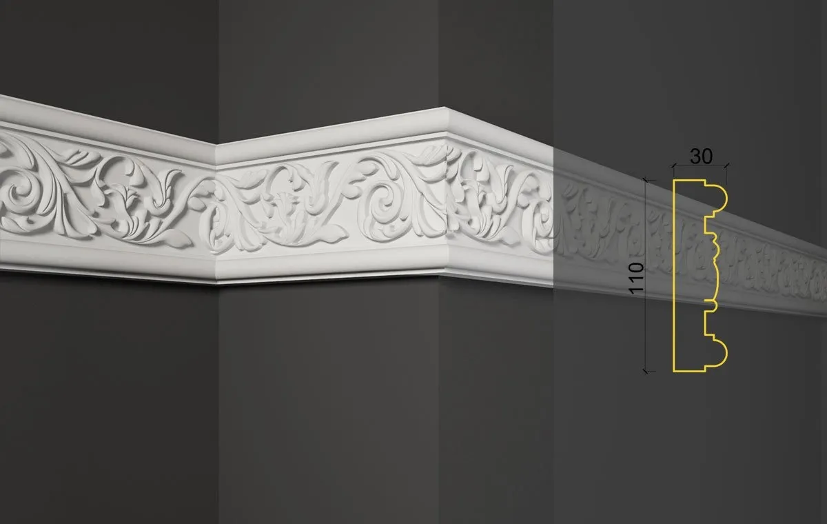 . Гипсовые элементы обладают рядом преимуществ, таких как экологическая безопасность, способность впитывать влагу, огнестойкость, долговечность до 100 лет, отличные декоративные характеристики, легкость в ремонте, идеальная форма каждого компонента и безупречная проработка деталей узоров. Фигурные планки поставляются в белом цвете и могут быть покрашены в любой оттенок, начиная от нейтральных до ярких, или покрыты золотом, а также подвергнуты патинированию.