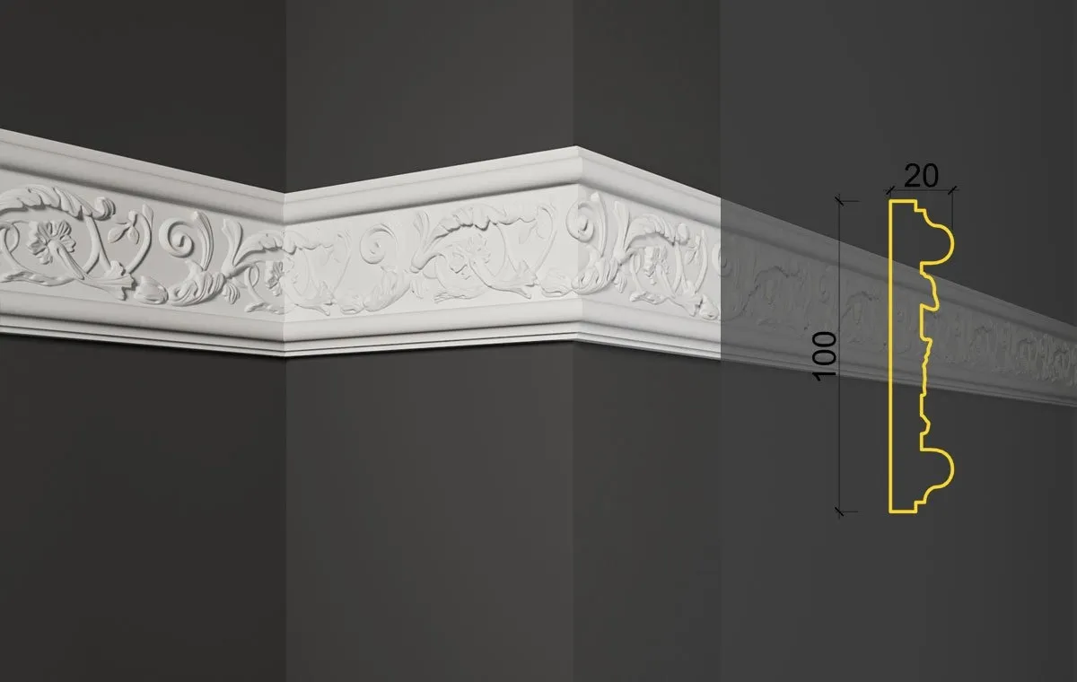 . Гипсовые элементы обладают рядом преимуществ, таких как экологическая безопасность, способность впитывать влагу, огнестойкость, долговечность до 100 лет, отличные декоративные характеристики, легкость в ремонте, идеальная форма каждого компонента и безупречная проработка деталей узоров. Фигурные планки поставляются в белом цвете и могут быть покрашены в любой оттенок, начиная от нейтральных до ярких, или покрыты золотом, а также подвергнуты патинированию.
