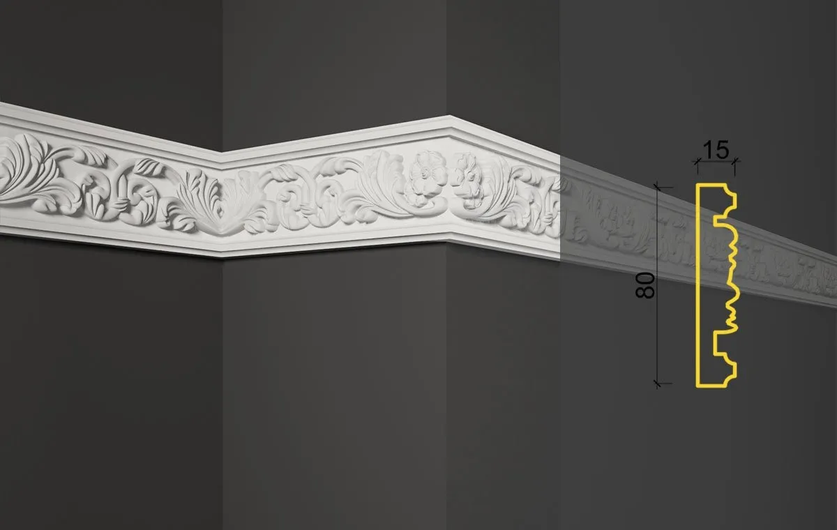 . Гипсовые элементы обладают рядом преимуществ, таких как экологическая безопасность, способность впитывать влагу, огнестойкость, долговечность до 100 лет, отличные декоративные характеристики, легкость в ремонте, идеальная форма каждого компонента и безупречная проработка деталей узоров. Фигурные планки поставляются в белом цвете и могут быть покрашены в любой оттенок, начиная от нейтральных до ярких, или покрыты золотом, а также подвергнуты патинированию.