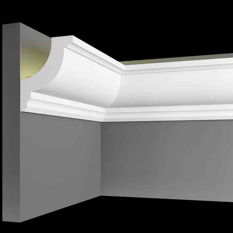 Карнизы из гипса для скрытого освещения - идеальное решение! Они отлично подходят для всех видов потолочных покрытий, включая натяжные потолки, и могут также использоваться в качестве карнизов для штор.
