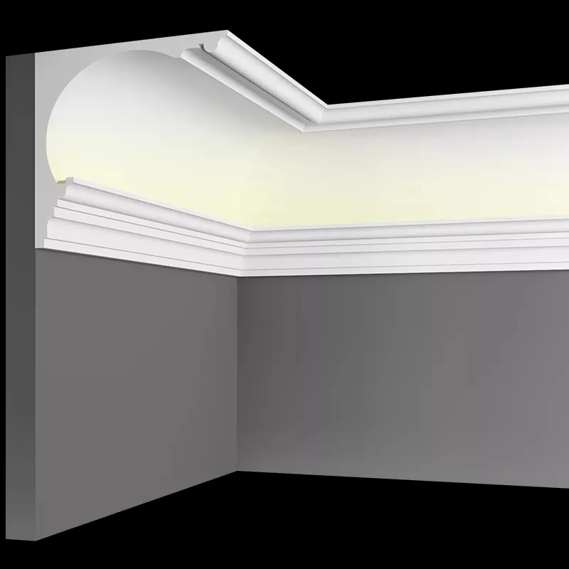 Карнизы из гипса для скрытого освещения - идеальное решение! Они отлично подходят для всех видов потолочных покрытий, включая натяжные потолки, и могут также использоваться в качестве карнизов для штор.