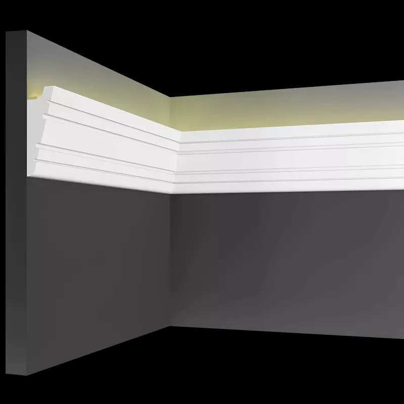 Карнизы из гипса для скрытого освещения - идеальное решение! Они отлично подходят для всех видов потолочных покрытий, включая натяжные потолки, и могут также использоваться в качестве карнизов для штор.