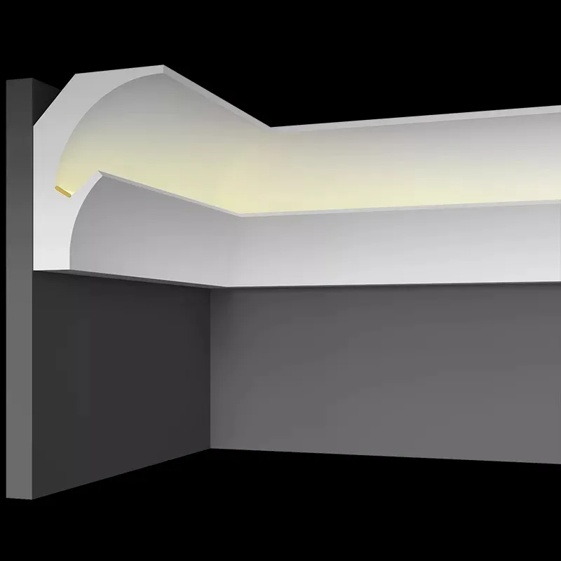 Карнизы из гипса для скрытого освещения - идеальное решение! Они отлично подходят для всех видов потолочных покрытий, включая натяжные потолки, и могут также использоваться в качестве карнизов для штор.