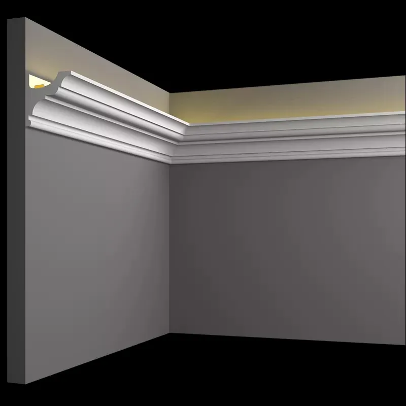 Карнизы из гипса для скрытого освещения - идеальное решение! Они отлично подходят для всех видов потолочных покрытий, включая натяжные потолки, и могут также использоваться в качестве карнизов для штор.