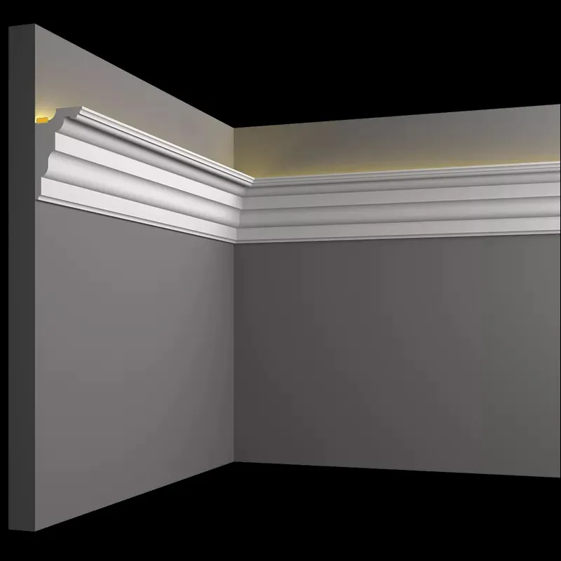 Карнизы из гипса для скрытого освещения - идеальное решение! Они отлично подходят для всех видов потолочных покрытий, включая натяжные потолки, и могут также использоваться в качестве карнизов для штор.