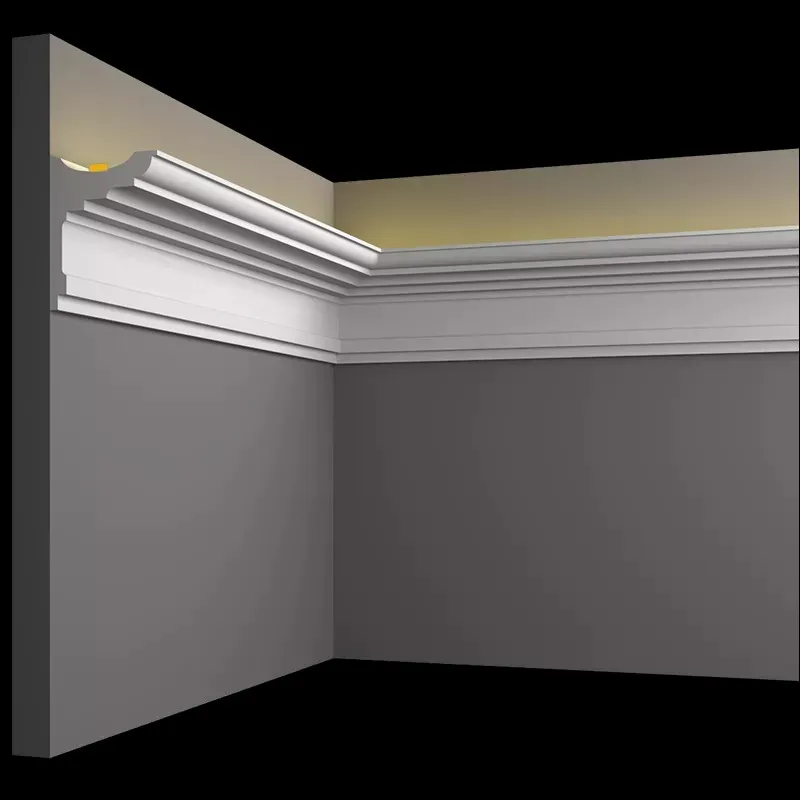 Карнизы из гипса для скрытого освещения - идеальное решение! Они отлично подходят для всех видов потолочных покрытий, включая натяжные потолки, и могут также использоваться в качестве карнизов для штор.
