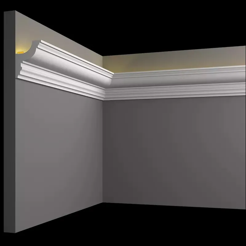 Карнизы из гипса для скрытого освещения - идеальное решение! Они отлично подходят для всех видов потолочных покрытий, включая натяжные потолки, и могут также использоваться в качестве карнизов для штор.