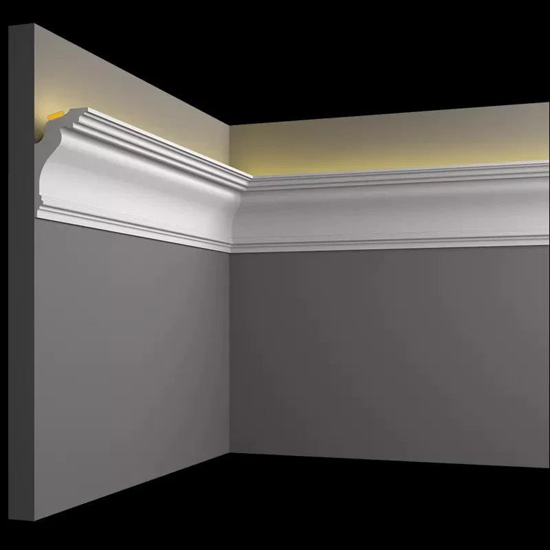 Карнизы из гипса для скрытого освещения - идеальное решение! Они отлично подходят для всех видов потолочных покрытий, включая натяжные потолки, и могут также использоваться в качестве карнизов для штор.