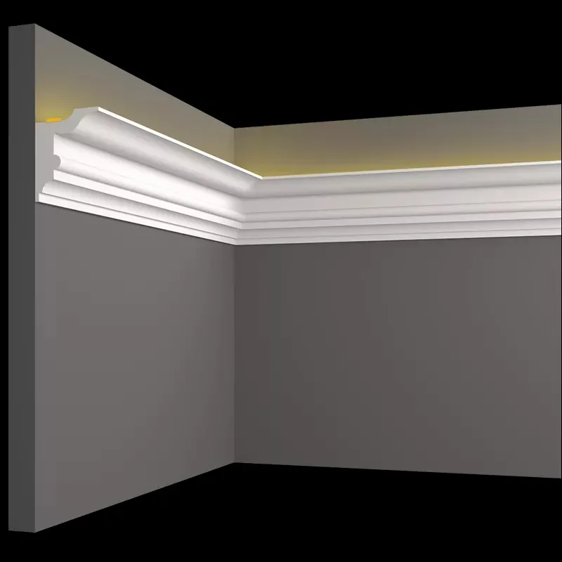 Карнизы из гипса для скрытого освещения - идеальное решение! Они отлично подходят для всех видов потолочных покрытий, включая натяжные потолки, и могут также использоваться в качестве карнизов для штор.