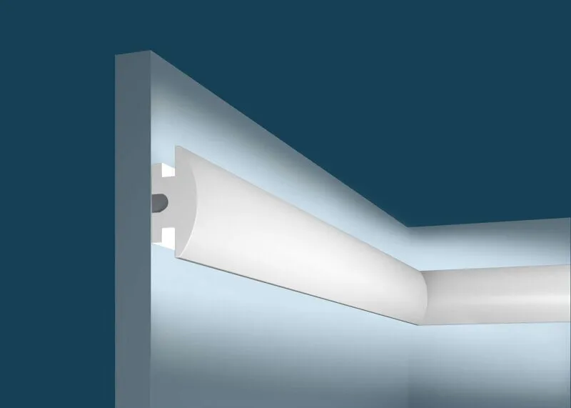 Молдинг для скрытого освещения MX010 из экополимера с добавлением светостабилизатора, ударопрочный, устойчивый к деформациям, влагостойкий, что позволяет использование во влажных помещениях.