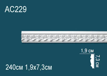 Молдинг AC 229 c орнаментом из полиуретана компании Перфект. Материал высокой прочности, гибкости, водонепроницаемого, стойкого к перепадам температур и воздействию света, что позволяет монтировать не только в сухих, но и влажных помещениях. С помощью молдингов можно оформить интерьер вашего помещения в любом стиле, разделять стены и потолки на зоны, создавая визуально условные панели. Часто полиуретановые молдинги используются как карнизы потолочные, и в отличие от них клеятся только на одну поверхность или к потолку, или к стене Для монтажа изделий рекомендуется использование монтажного и стыковочного клея во избежание расхождения швов. Перед покраской рекомендуем прогрунтовать изделия для лучшего окрашивания лакокрасочными материалами не содержащие растворителей. Имеет гибкий аналог.