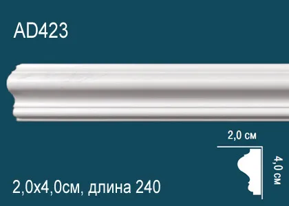 Молдинг AD 423 с гладким профилем из полиуретана компании Перфект. Материал высокой прочности, гибкости, водонепроницаемого, стойкого к перепадам температур и воздействию света, что позволяет монтировать не только в сухих, но и влажных помещениях. С помощью молдингов можно оформить интерьер вашего помещения в любом стиле, разделять стены и потолки на зоны, создавая визуально условные панели. Часто полиуретановые молдинги используются как карнизы потолочные, и в отличие от них клеятся только на одну поверхность или к потолку, или к стене Для монтажа изделий рекомендуется использование монтажного и стыковочного клея во избежание расхождения швов. Перед покраской рекомендуем прогрунтовать изделия для лучшего окрашивания лакокрасочными материалами не содержащие растворителей.