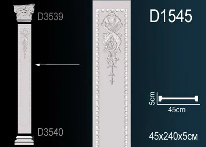Ствол пилястры D1545 производителя Перфект из полиуретана. Ими декорируют не только гостиные или прихожие, но и рабочие кабинеты, вестибюли и холлы административных зданий, офисных помещений. Пилястры украшают каминные порталы, дверные проемы, используются в оформлении мебели. Наш интернет магазин представляет широкий выбор как рельефных, так и гладких стволов. Увеличить высоту пилястры возможно при помощи приобретения дополнительного ствола и соединить при помощи монтажного и стыковочного клея. Пилястра состоит из трех частей: Капитель, база и ствол который является средней частью композиции.