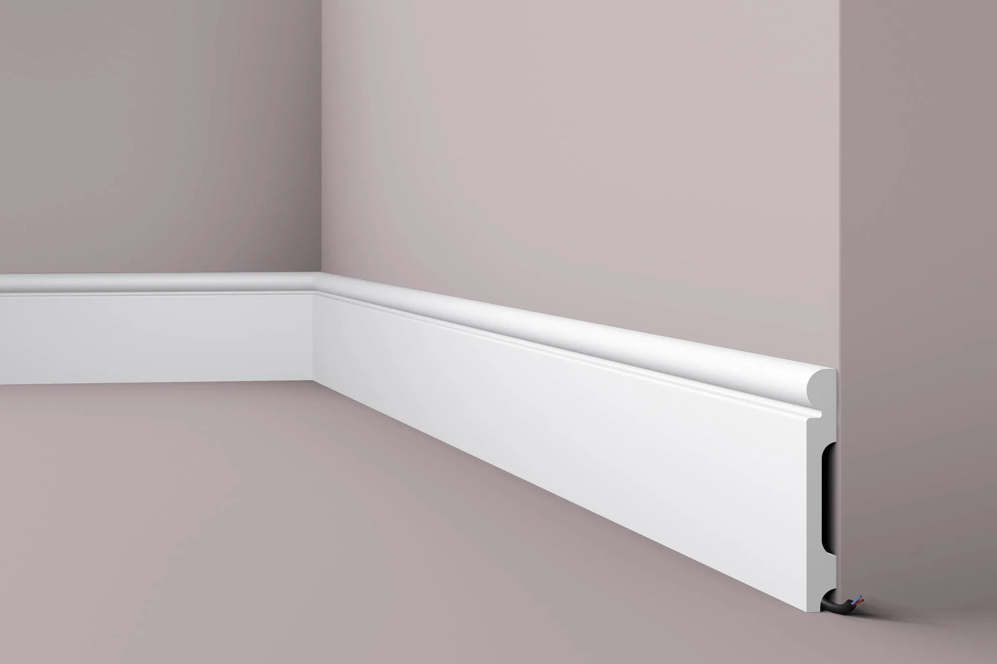 Напольный плинтус FL4 из дюрополимера, бельгийского производителя nmc. Плинтус про грунтован имеет идеальную поверхность для окрашивания красками не содержащие растворитель, легко монтируется.