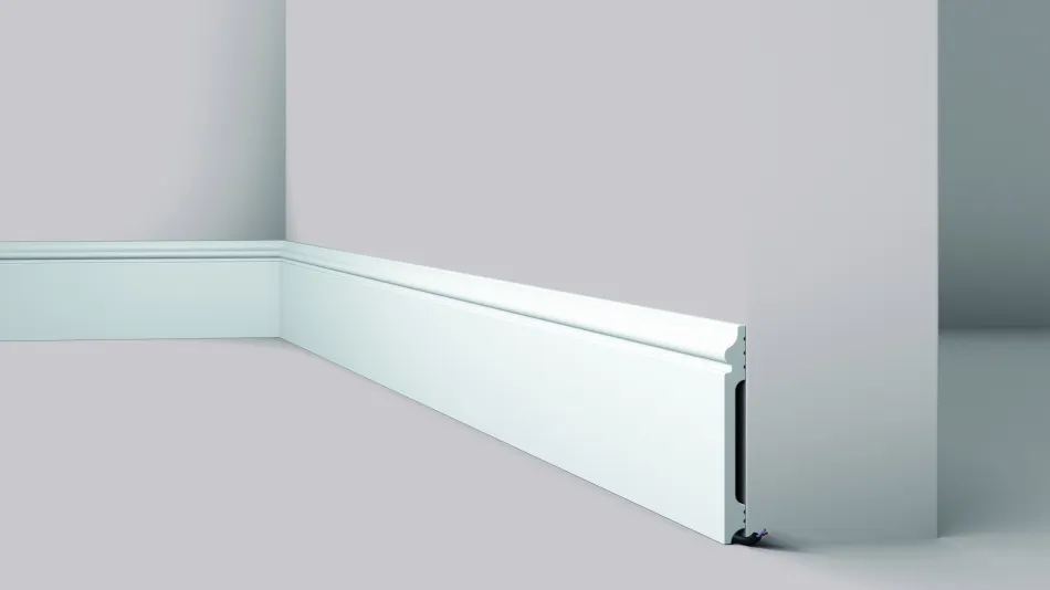 Напольный плинтус FL14 из дюрополимера, бельгийского производителя nmc. Плинтус про грунтован имеет идеальную поверхность для окрашивания красками не содержащие растворитель, легко монтируется.
