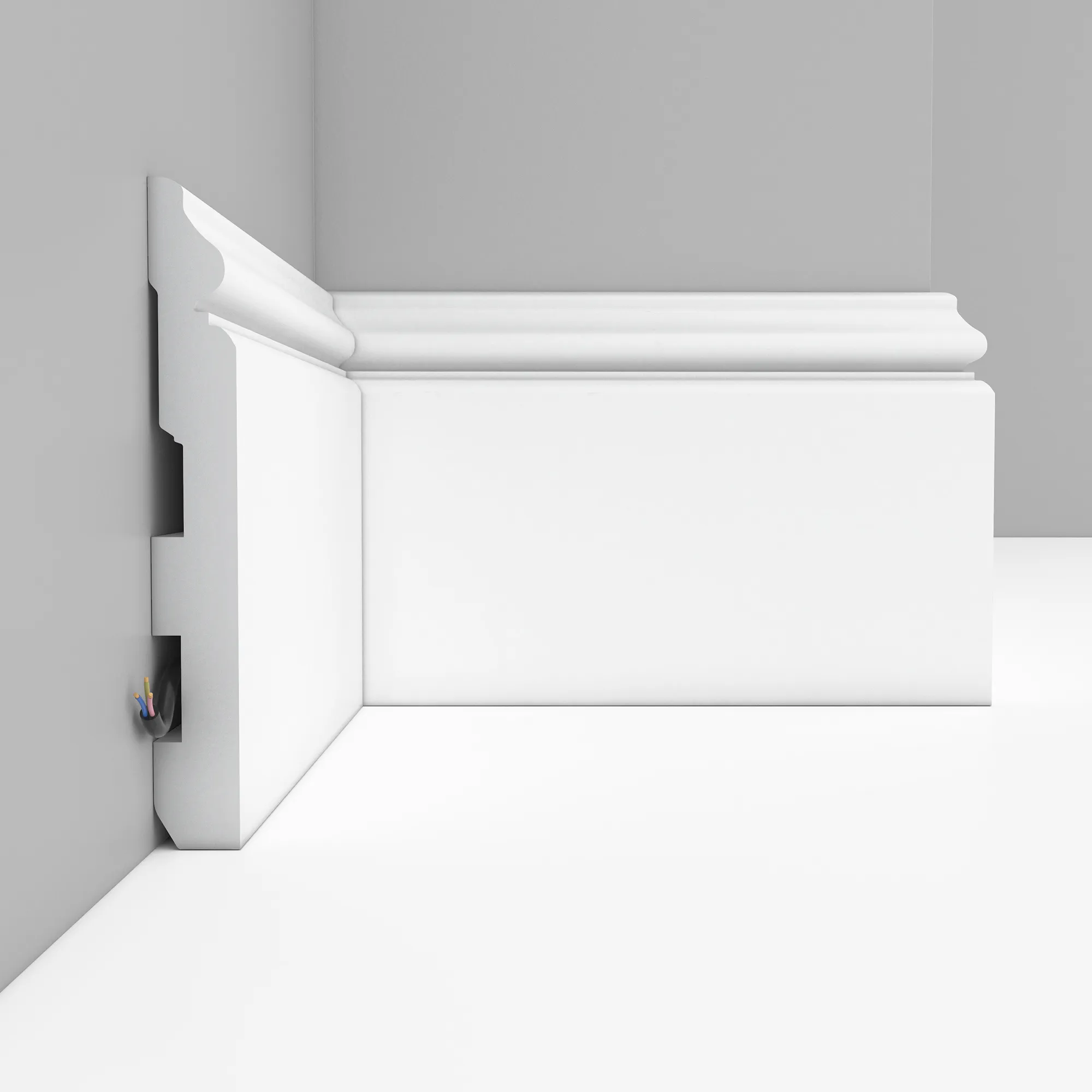 Напольный плинтус A118 Decomaster из дюрополимера он же (экополимер, композит, фитополимер) ударопрочной, легкий в монтаже. Плинтус готов к покраске лакокрасочными материалами не содержащие растворитель. Дюрополимер не содержит токсичных продуктов и со временем не дает усадку. Рекомендуется использовать стыковочный клей для соединительных стыков.